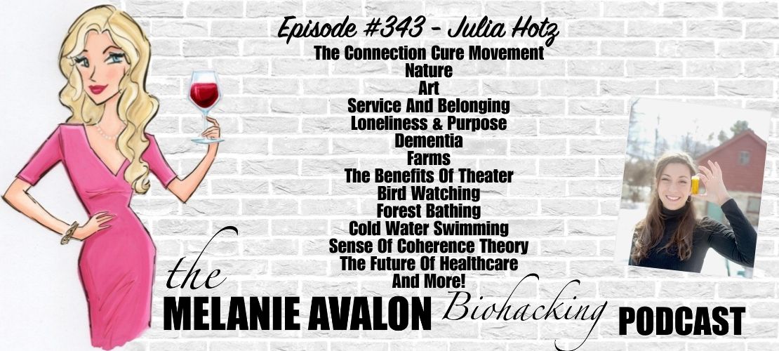 We talk about so many cool concepts, including things like the benefits of theater and birdwatching, dementia farms to address Alzheimer's, the benefits of nature and forest bathing, and what to do if you don't like going outside like me, cold water swimming, sense of coherence theory, the practical, actual, and ideal future of healthcare, and so much more. The show notes for today's episode will be at melanieavalon.com slash connection. Those show notes will have a full transcript as well as links to everything that we talked about, so definitely check that out. I can't wait to hear what you guys think. Definitely let me know in my Facebook group, I have biohackers, intermittent fasting plus real foods plus life. Comment something you learned or something that resonated with you on the pinned post to enter to win something that I love, and then check out my Instagram, find the Friday announcement post, and again, comment there to enter to win something that I love. All right, I think that's all the things. Without further ado, please enjoy this fabulous conversation with the incredible, wonderful Julia Hotts. Hi friends, welcome back to the show. I am so incredibly excited and I've been looking forward to the conversation that I am about to have. So the backstory on today's conversation quite a while ago now, I'm not sure how long ago, it was a while ago, our dear mutual friend, Andrew McConnell introduced me to the fabulous woman I am here with now.